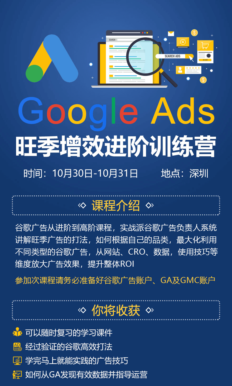 在旺季,除了要选品精准之外,还需要广告打得好。优乐出海将在10月30日举办线下培训课啦,跨境电商谷歌广告投放即将开课啦!