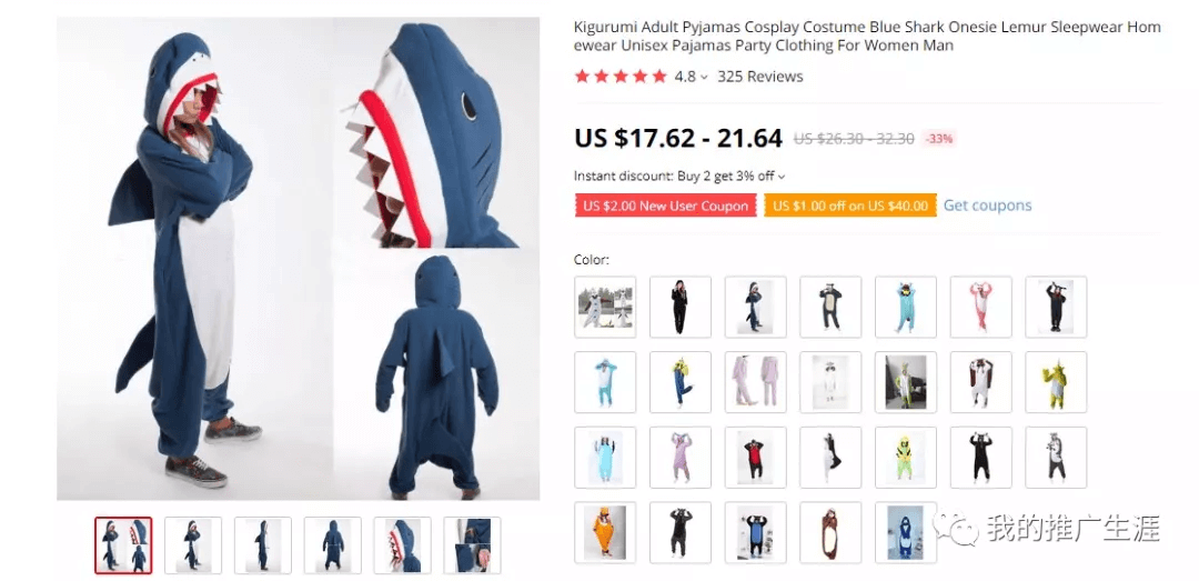 “我”在速卖通上面找了很久,最后发现了这款儿童鲨鱼服装,因为美国的小朋友大部分都听过“小鲨鱼”这首歌,所以这款产品还是有着很大的潜在市场需求的。