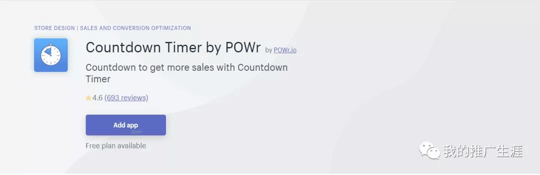 Countdwon Timer By Powr,促销倒计时插件,这个虽然可以让用户产生紧迫感从而提高转化率,但是有些时候投放广告的时候要小心,可能审核不通过。
