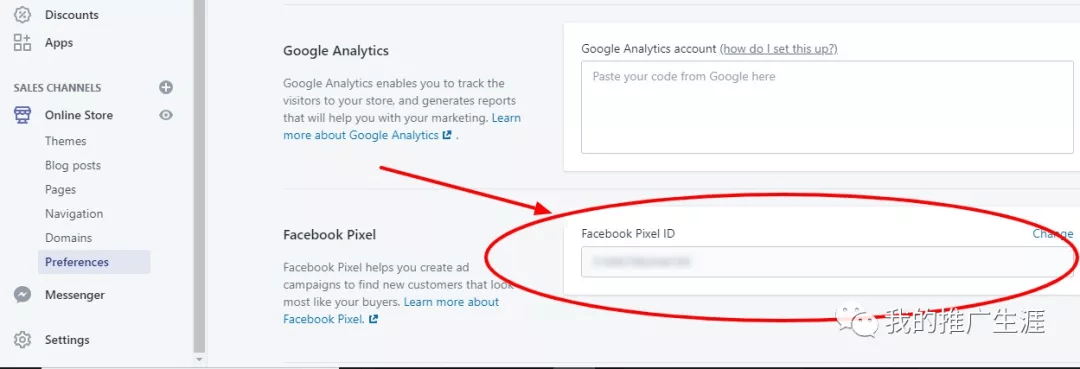 在Shopify店铺后台,在线商店 - 偏好设置,找到Facebook Pixel然后黏贴上你的像素代码就可以了。