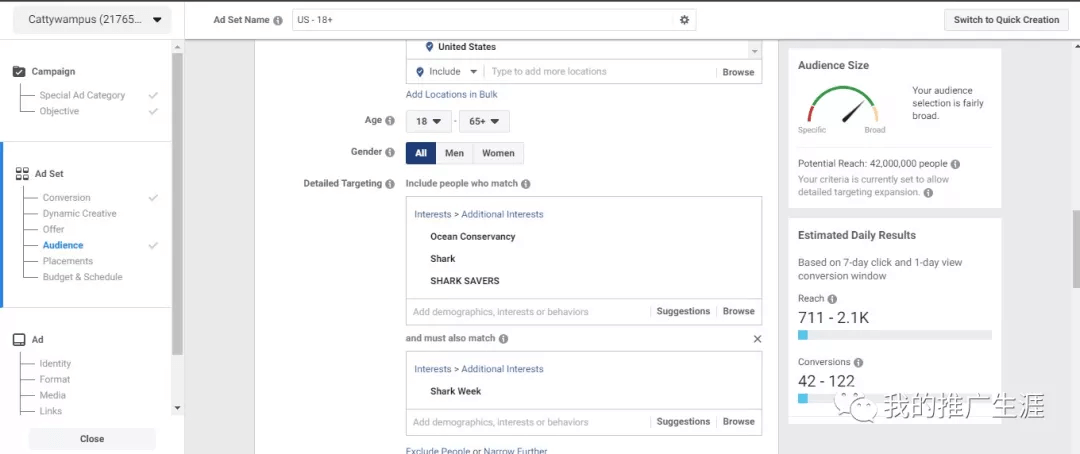 受众定位,“我”定位了美国,年龄段18到65岁,性别所有,细分定位了ocean conservancy,