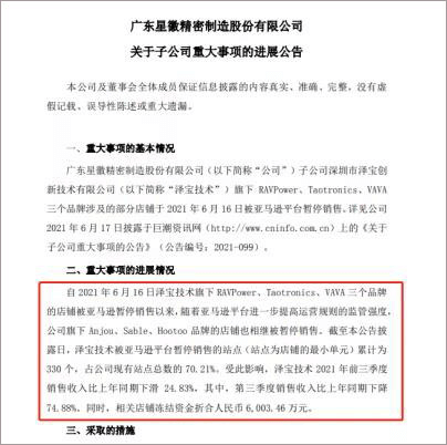 尤其是在华南卖家们损失惨重,其中就包含了华南四少,帕拓逊,泽宝,万拓,通拓,蓝思科技、宝视佳、有棵树等大卖家。据悉,在6月大卖泽宝旗下Anjou、Sable、Hootoo共三个品牌的店铺已经被暂停销售,且被暂停销售的站点累计有330个,占公司现有站点总数的70.21%。受此影响,泽宝前三个季度的销售收入比上一年同期下滑了24.83%。其中,第三季度销售收入比上年同期下降 74.88%。同时,相关店铺冻结资金折合人民币高达 6,003.46 万元。