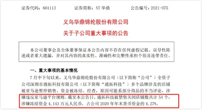 ST华鼎股份公告指出,被封号的原因可能是部分商品的不当评论,涉嫌违反了亚马逊平台规则。