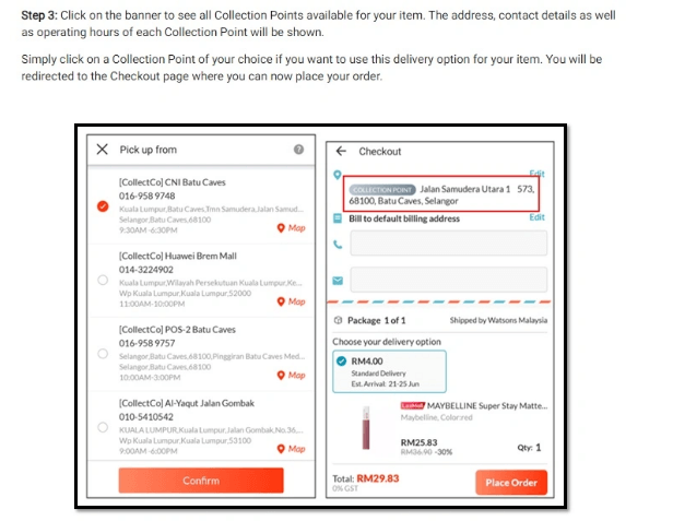 在结账页面选择取件点取货,买家在选择产品后,在结账页面可以选择送货地址,系统将会显示客户地址附近的包裹取件点;选取所需要的的包裹取件服务点,在确认订单后等待收到产品。