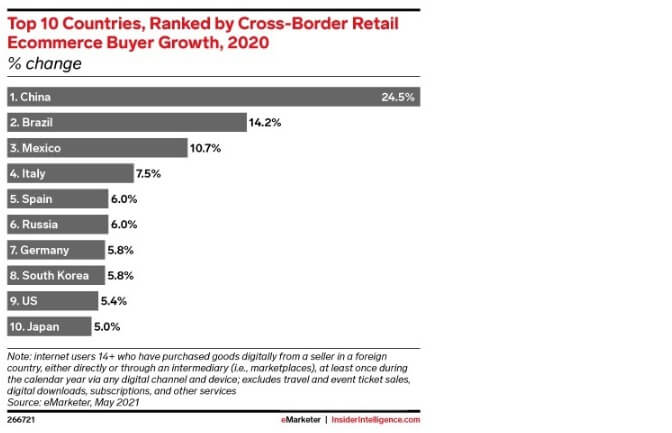 eMarketer研究显示,2020年中国是迄今为止跨境电商增长最快的市场,在14岁及以上的互联网用户中,有24.5%的人进行过跨境网购。其次是巴西(14.2%),而美国则远远落后(5.4%)。