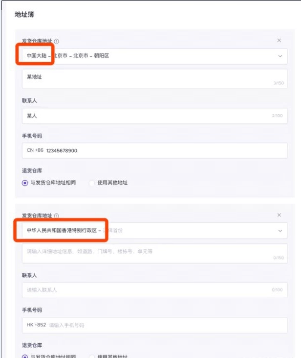 8. 无论是中国大陆还是中国香港主体卖家,都可以填写1到2个仓库。