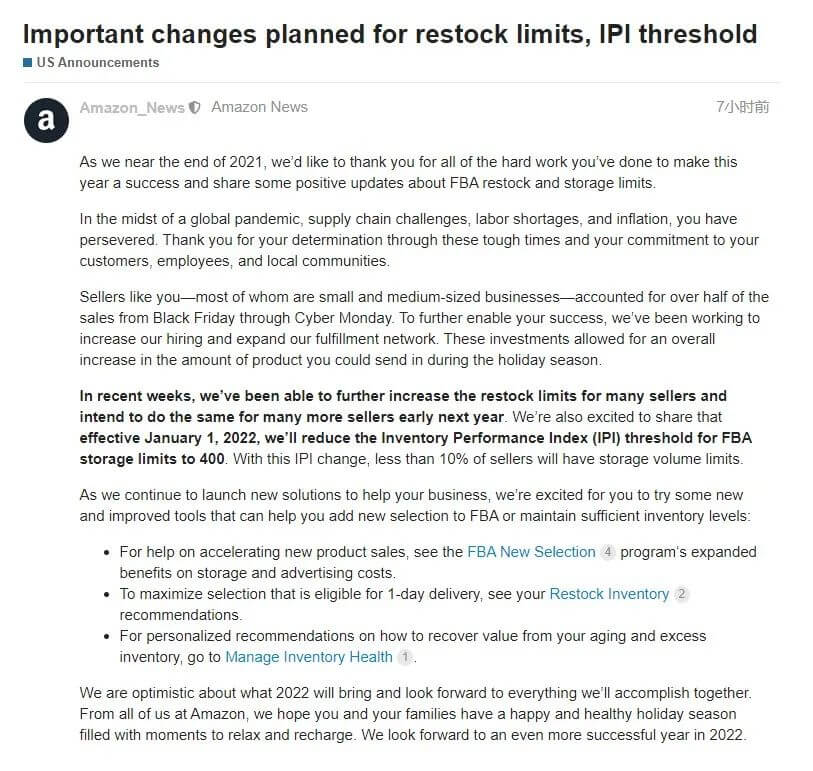 就在跨境电商行业来到了销售低谷之际,美亚一声炮响,为广大电商卖家送来了新的曙光——亚马逊表示,自2022年1月1日起,亚马逊美国站IPI阈值将降至400,这也就意味着只有不到10%的卖家会有存储量限制。