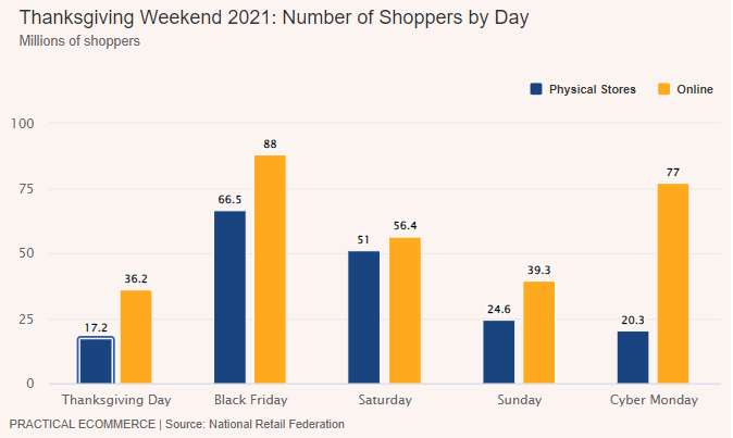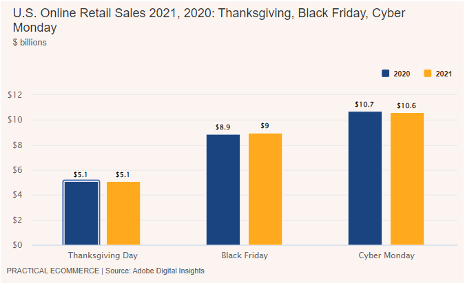 先看本年度全美旺季的消费状况回顾!依据11月30日,Adobe数字经济指数发布的2021年11月份全美在线销售数据,我们可以看到,自感恩节到网络星期一(网络周)以来,全美在线销售额达339亿美元,同比去年下降了1.4%;其中感恩节同去年持平为51亿美元,但黑五期间却同比下降至89亿美元,而网络星期一在线销售额更是同比下降至107亿美元。网络周的在线销售额出现了有史以来的首次下降,所以不得不承认,2021绝对给了跨境电商卖家一个难以忘怀的创伤。