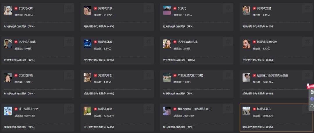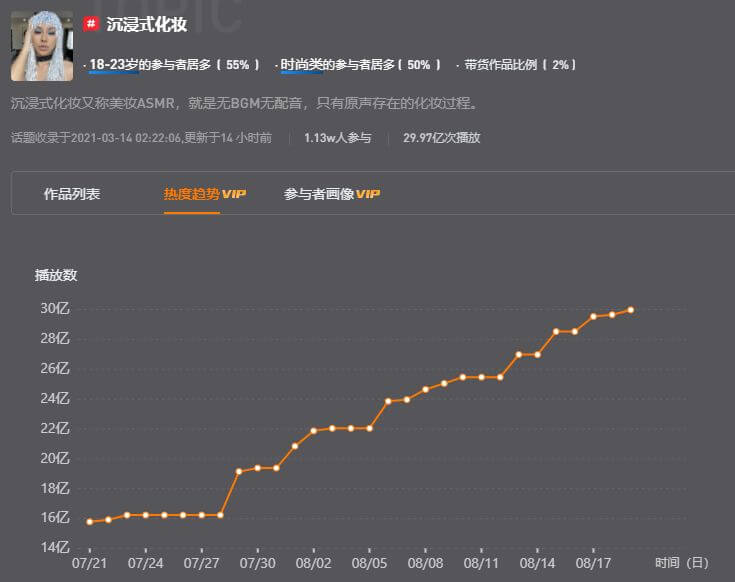 以热度最高的话题“沉浸式化妆”为例,播放量已经近30亿次。话题热度趋势显示,最近一个月内,“沉浸式化妆”的参与人数翻了一倍,播放量也是暴涨100%。