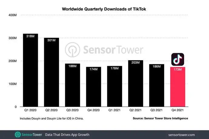 2021年,TikTok的使用率同比下降,很大程度上是由于在2020年年中失去了进入印度市场的机会。去年,该应用在全球的首次安装量达到了7.4亿次,比2020年的9.807亿次减少了25%。此外,这款应用也成功突破了30亿次用户安装的里程碑,成为除facebook外首次达成这一成就的应用。