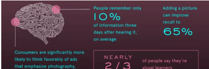 图像之所以对我们有如此大的吸引力,是因为我们大脑处理视觉接受能力所占有的资源达到了我们大脑总体的50%,比其他任何感官或能力都要多,所以我们接受到一个视觉场景的速度要远远快于阅读一篇文字。而对于通过图片所摄入的资讯,人脑可在三天后记得65%,但通过文字摄取的信息,三天后仅仅只有3%。