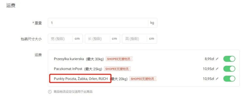 2.针对首次购买的新用户,原有新客补贴不变 Shopee波兰站点新增物流渠道通知 2022年1月26日00:00,波兰站点新增Punkty Poczta, Żabka, Orlen, RUCH(派送到自提点)渠道。具体费率见下表: