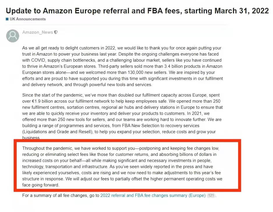 随后亚马逊也对此次FBA费用上调给出了解释:由于疫情期间,亚马逊一直为卖家提供支持,推迟并保持较低的费用变化,同时加大对人员、技术、交通和基础设施等重大且必要的投资。而这些正在促使成本上升,因此今年需要对费用结构进行调整,用以抵消亚马逊未来面临的更高的永久性运营成本。