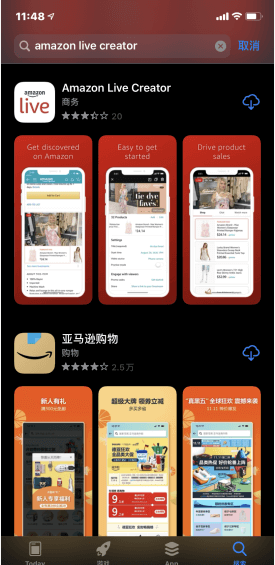 第一步:在iOS APP Store商城下载Amazon Live Creator应用程序。该应用目前仅支持iPhone 手机。Amazon Live Creator 也可以在 iPad 上使用,但无法获得最佳使用体验。