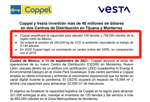 Vesta 首席执行官 Lorenzo D. Berho也称,通过更多的位置,创造足够的物流空间和设备来作为Coppel发展电商渠道的强力后盾。