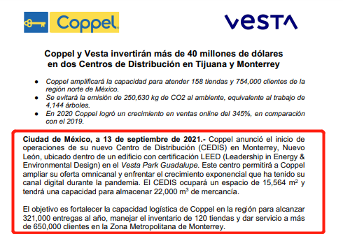 在2021年9月13日,Coppel宣布开始其位于蒙特雷的新配送中心 (CEDIS) 的运营,这是与工业园区公司 Vesta合作的项目,号称能够存储 22,000 立方米的商品,这是Coppel对物流渠道的一个巨大投资。