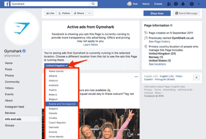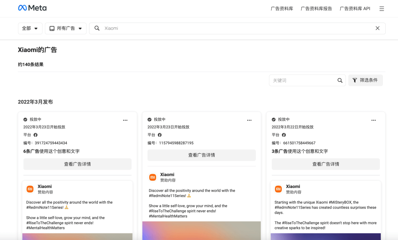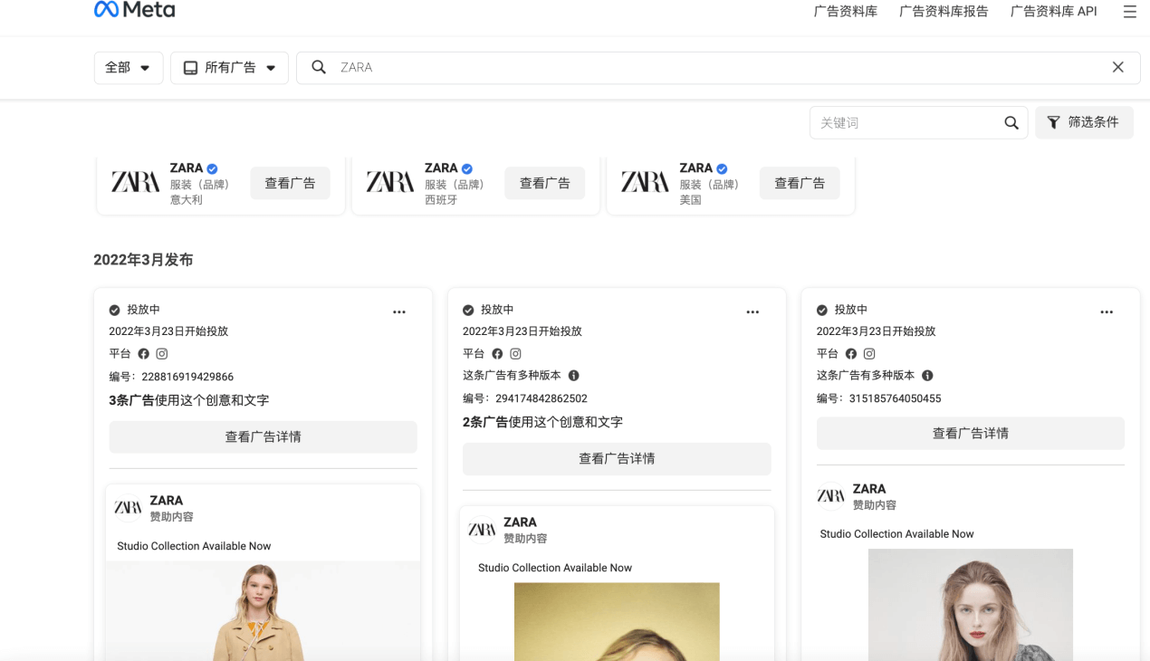 点击该标签后,你可以向下滚动查看该品牌的所有活跃广告,即使你不是广告的目标受众。除此之外,你还可以按国家或地区查看广告。