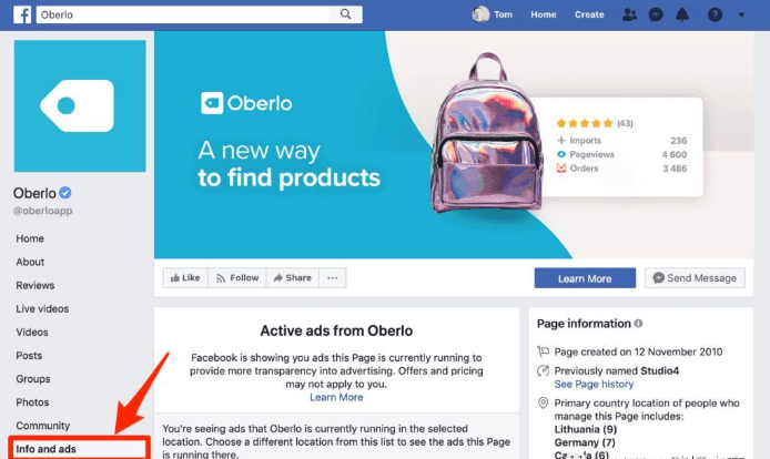 在其中找到你想研究的品牌,然后点开该品牌的Facebook Business Page(商务主页)。接着找到左侧功能栏,其品牌用户名下方有一个Info and Ads标签,如下图所示: