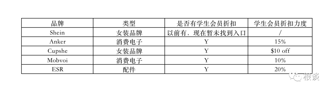 以下是公众号根谈统计的比如Shein,Anker,Cupshe,Mobvoi,ESR等品牌针对大学生用户人群都提供特殊的折扣优惠。