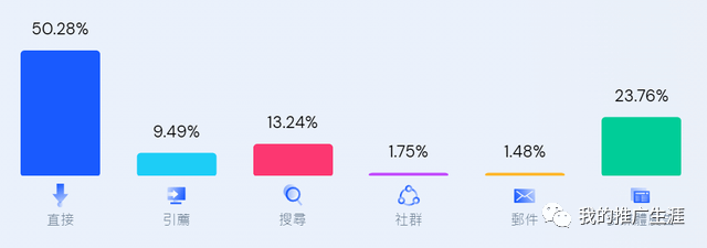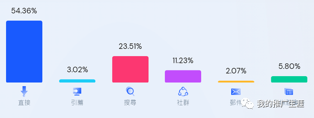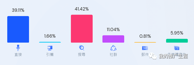 直接流量和多媒体广告流量占据了最主要的入口,其次是推荐和搜索搜索量,最后是社交和邮件流量。