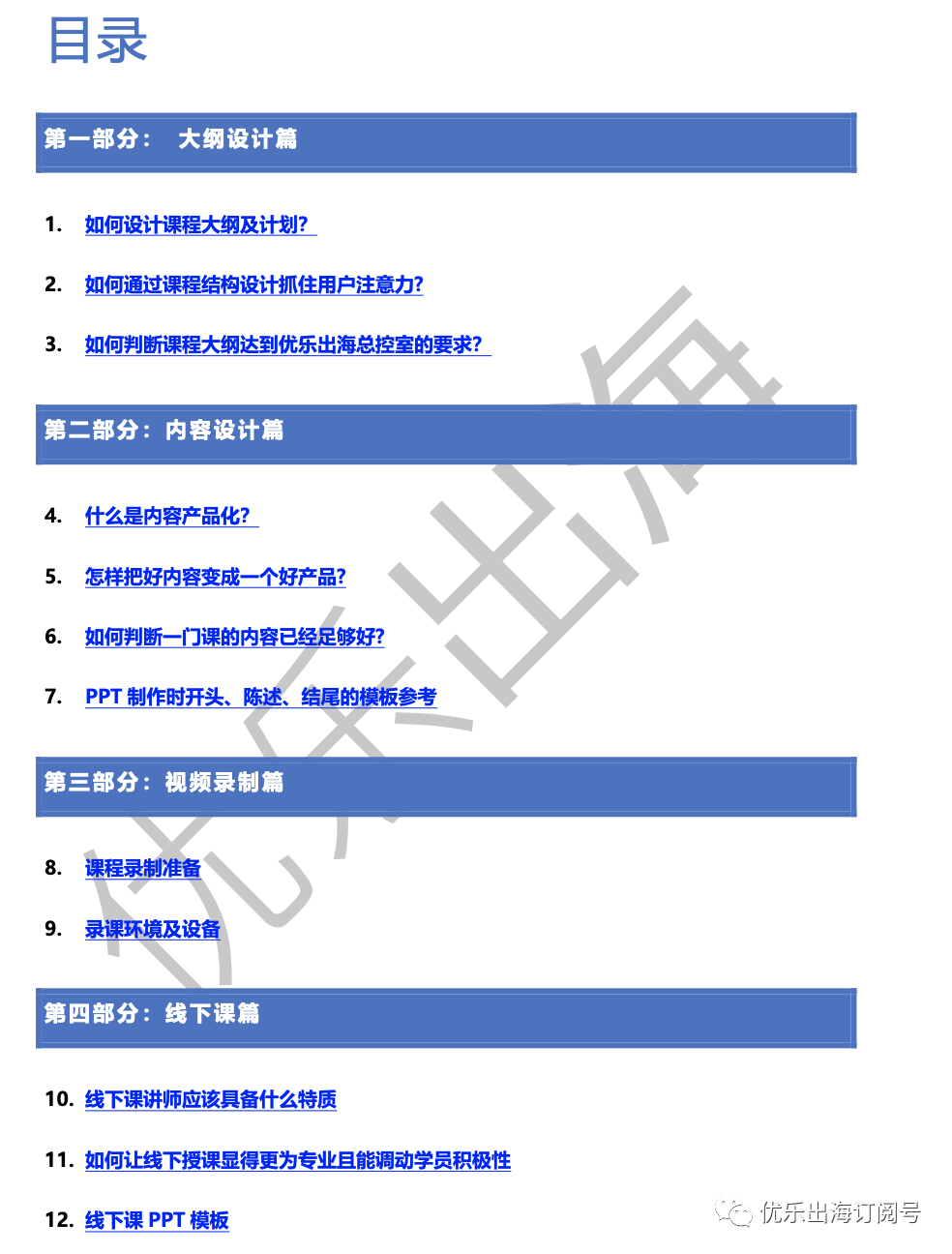 为了确保课程质量,提供优质的线上教学。优乐出海结合3T培训,综合几百位合作卖家讲师的课程设计过程,历经半年时间打磨,正式推出了《优乐出海产品品控手册》。