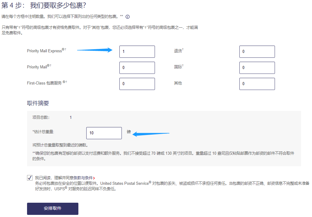 在预约上门取件时,您可以在家或办公室让邮递员取走任意数量的包裹,但是,每个包裹的重量都不能超过70磅。