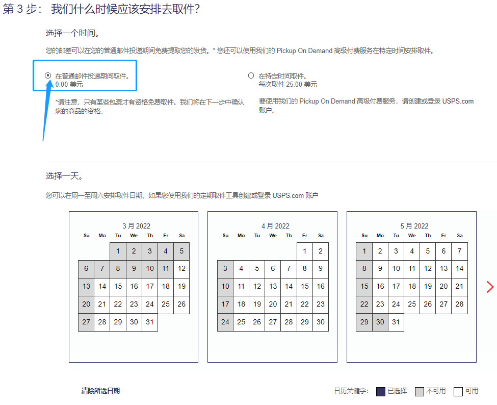 ③ USPS提供2种取件时间选项