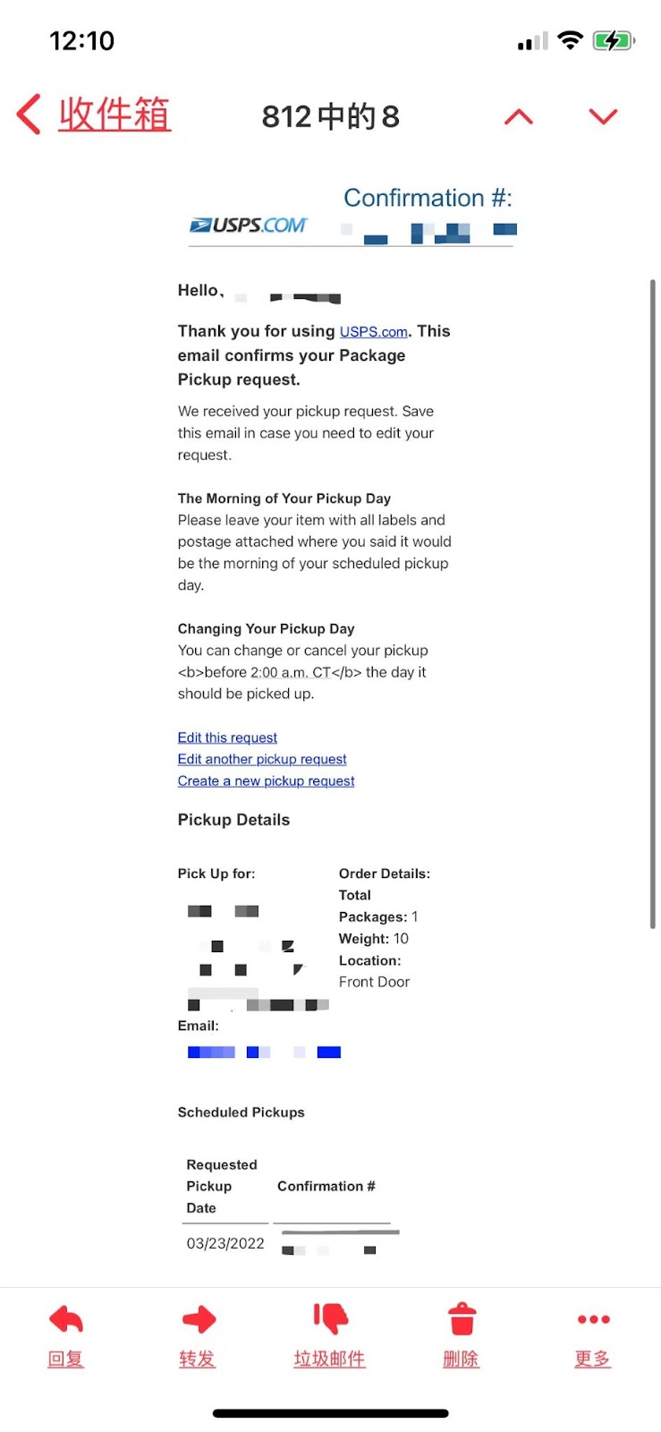 上门取件预约完成后,USPS会发一封邮件告知您的取件详细信息,所以不用担心信息的丢失。