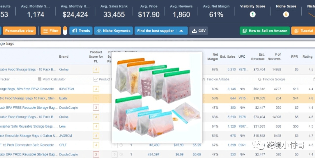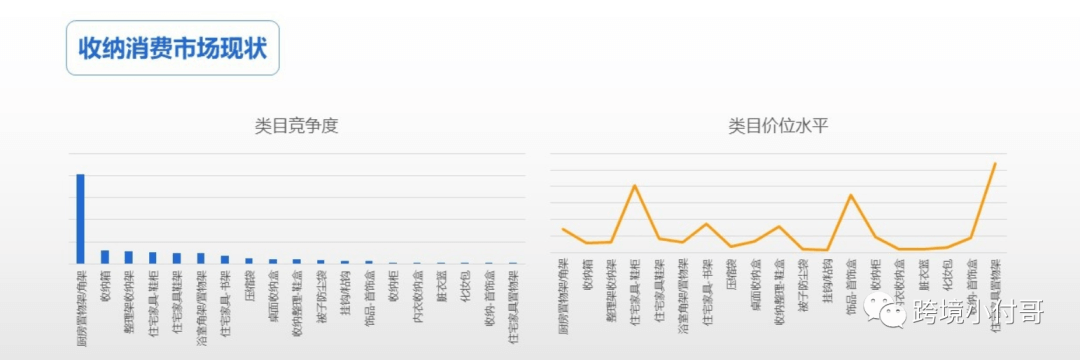 从产品类目竞争度上来看,厨房置物架类目较高,其他依次是收纳箱类目,整理收纳架类目,住宅家居鞋柜类目。从类目价位水平上来看,住宅家具搁板/置物架 类目价位最高,脏衣篮类目价位最低。收纳用品,是我们日常生活中时常会用到的产品,也是一个规模很大的市场,我们生活里需要收纳的东西在逐渐增多,收纳用品也成了一个必不可少的配套设施。随着生活水平的不断提升,随着大家对健康水平的持续不断关注,冰箱食物收纳袋这一类的产品一定会被大众所熟知。冰箱食物收纳袋也是我们在收纳整理类目下找到的利基产品代表之一,产品竞争力不大,同时也预示着这一款产品的市场并不是很庞大,很符合我们利基产品的特征,需要我们卖家做的就是尽快整合供应链资源占据市场。