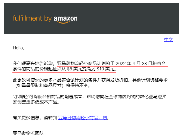 如下,亚马逊物流轻小商品计划将于2022年4月28日将符合条件的商品的价格起征点从8美元提高到10美元。