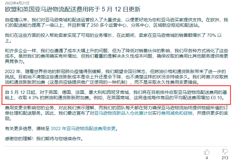 继美国宣布将从4月28日收取5%的燃料和通货膨胀附加费之后,欧盟和英国也将从5月12日开始收取4.3%的燃油和通货膨胀附加费。例如,在英国站,这将造成每件商品的平均配送费用增加£0.10。